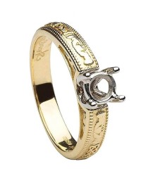 For those who love the rich blue of sapphires and a Celtic setting, this 14k yellow and white gold ring is the perfect choice, making it one of our most popular designs. The 0.50 carat sapphire has a sparkling white diamond on either side and all three stones are securely mounted in a Trinity knot shoulder design with a claw setting for the sapphire. Your ring will be hallmarked for quality by the Dublin Assays Office.