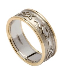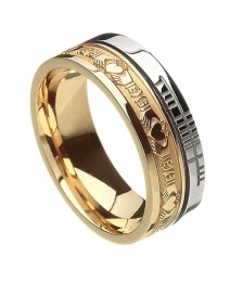Présentation de l'alliance bicolore Engraved Claddagh. Les symboles de Claddagh gravés dans la bande centrale en or jaune et les motifs entrelacés de nœuds celtiques les.